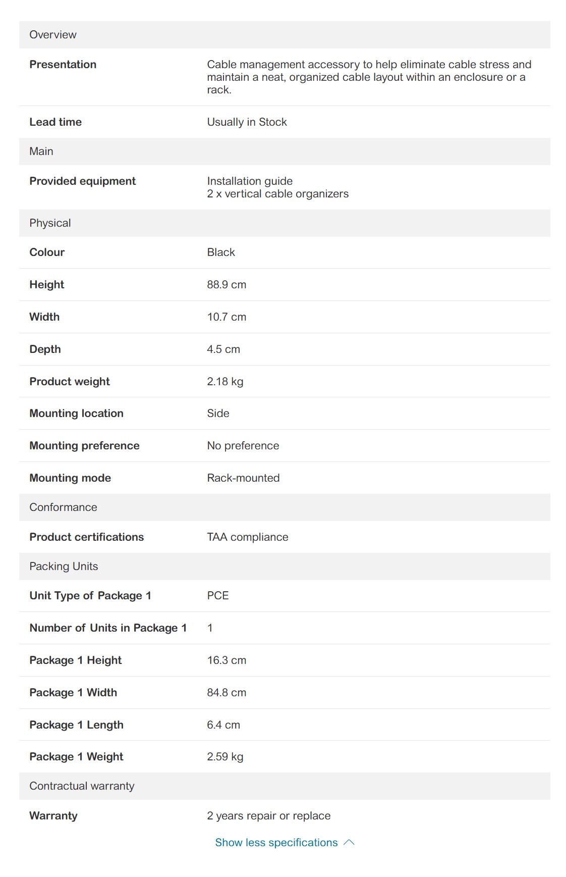 APC NetShelter Cable Management, Vertical Cable Manager, for NetShelter SX 600mm Wide 42U, Set of 2, 107 x 889 x 45 mm
