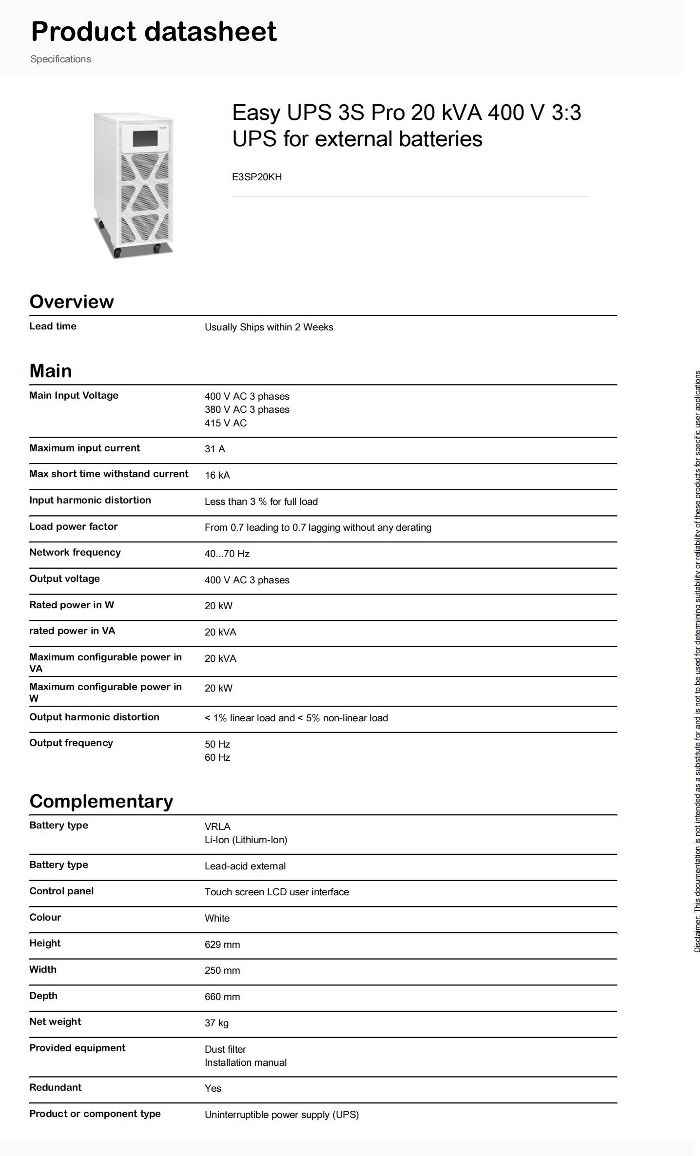 Easy UPS 3S Pro 20 kVA 400 V 3:3 UPS for external batteries