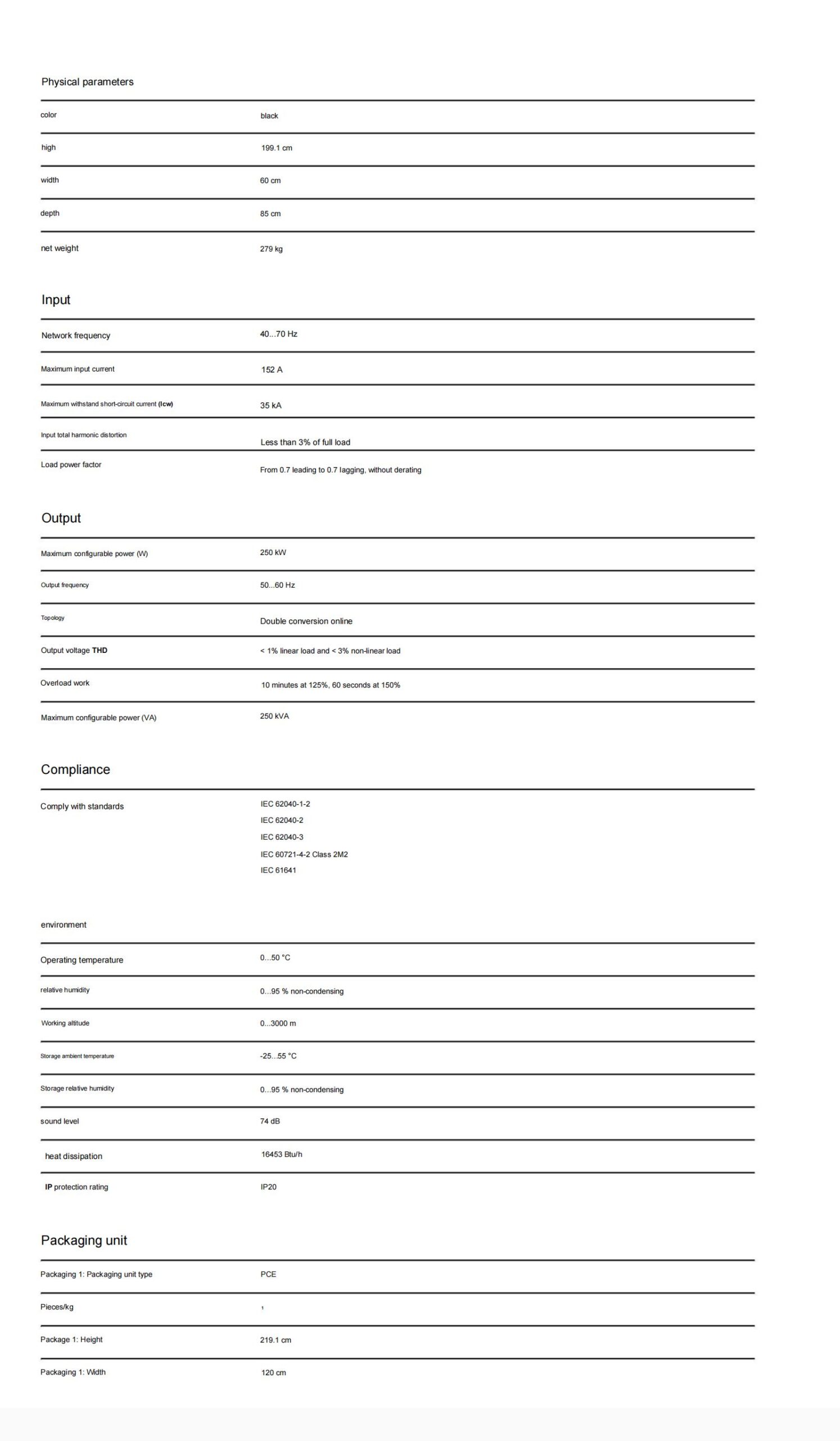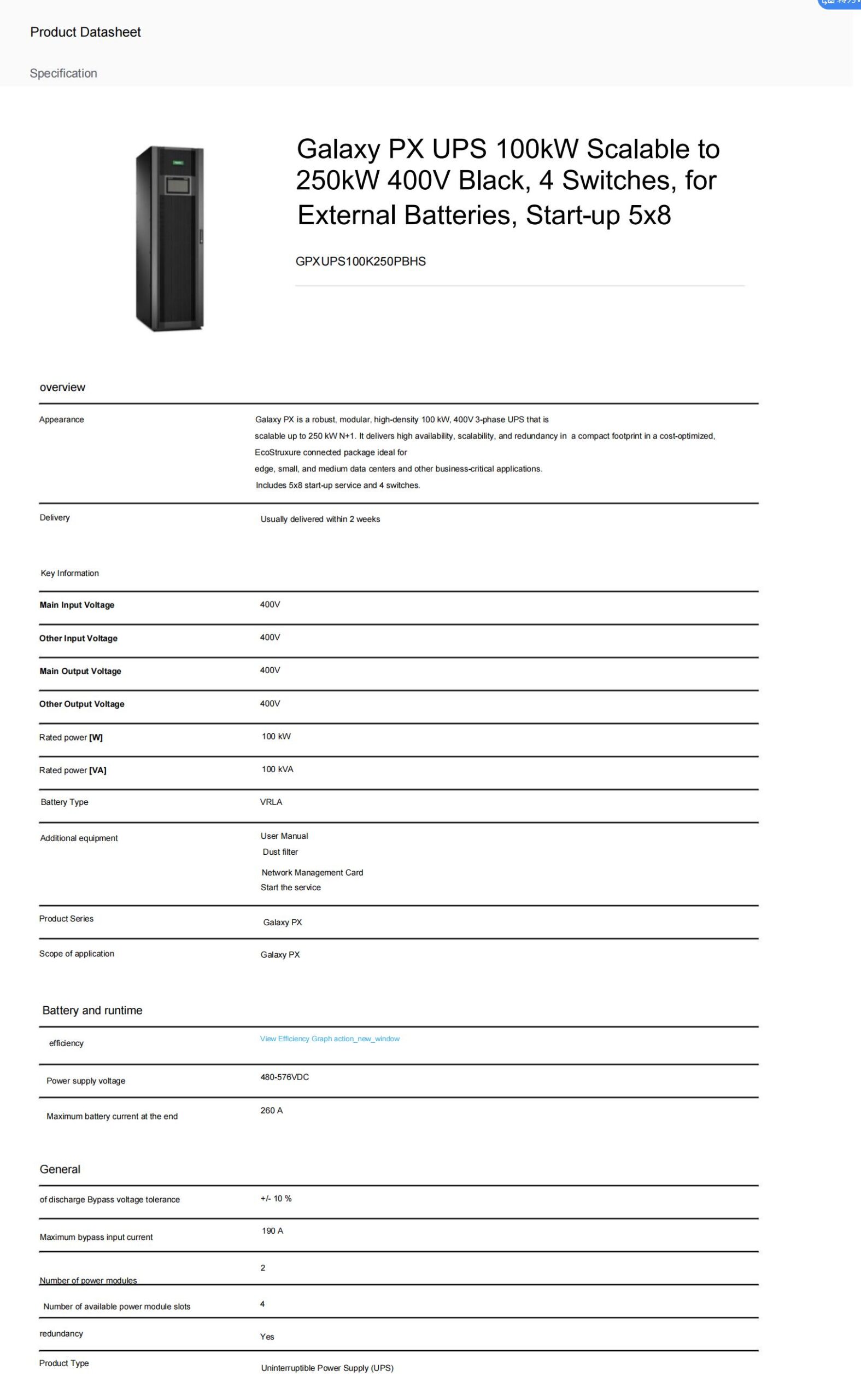 Galaxy PX UPS 100kW Scalable to 250kW 400V Black, 4 Switches, for External Batteries, Start-up 5×8