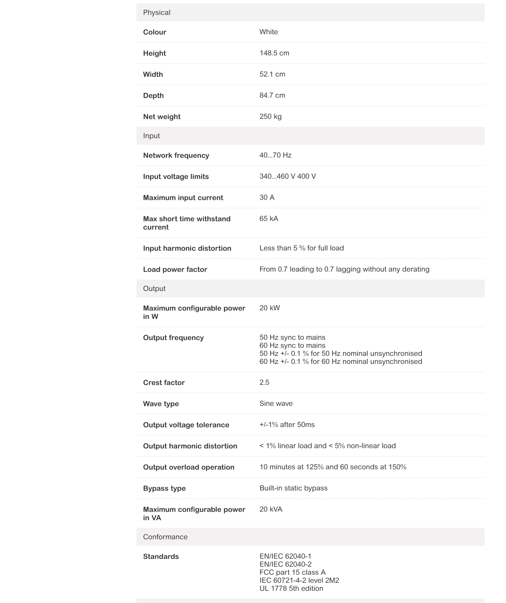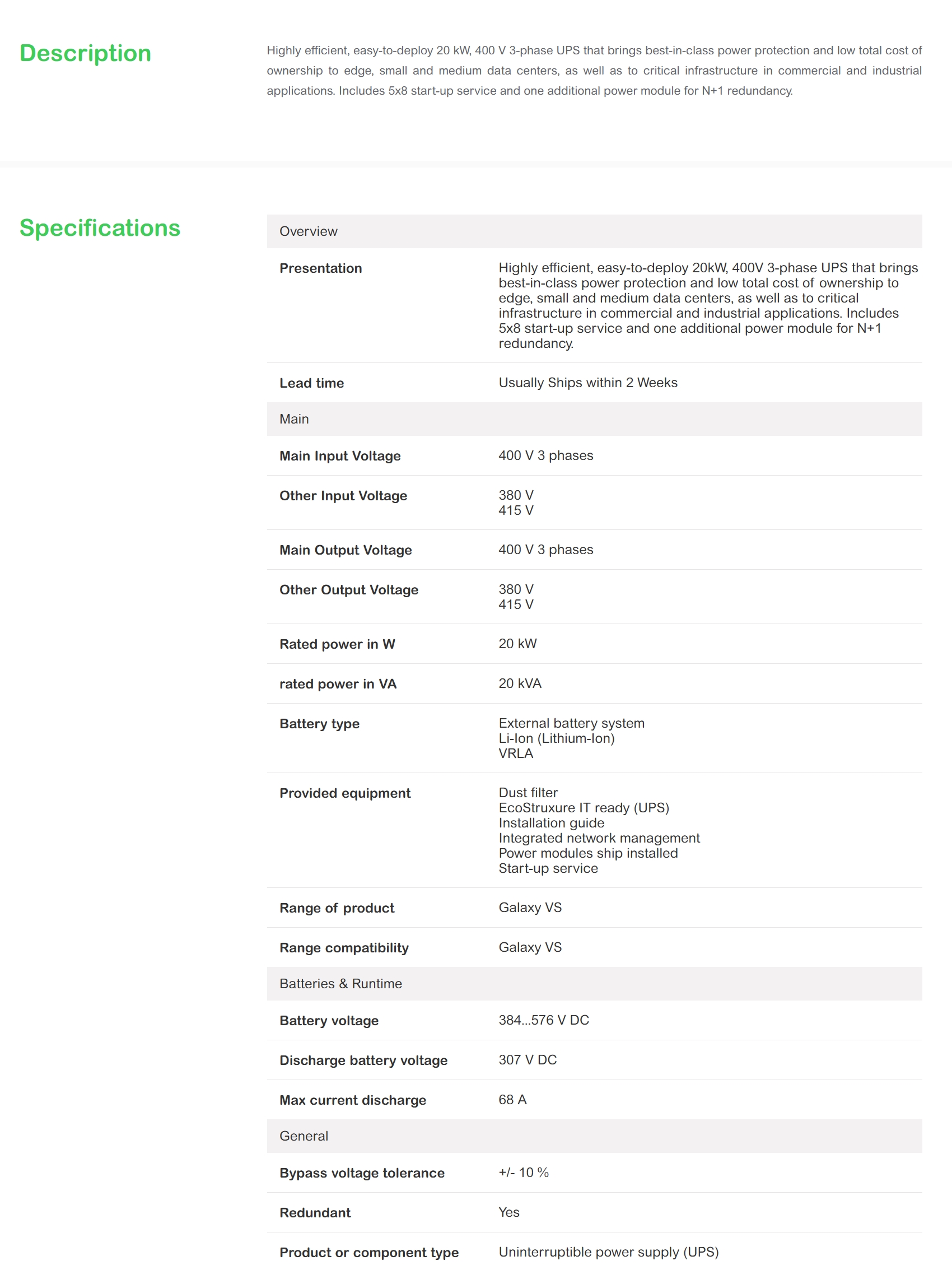 Galaxy VS UPS 20kW 400V with N+1 power module for external batteries Start-up 5×8