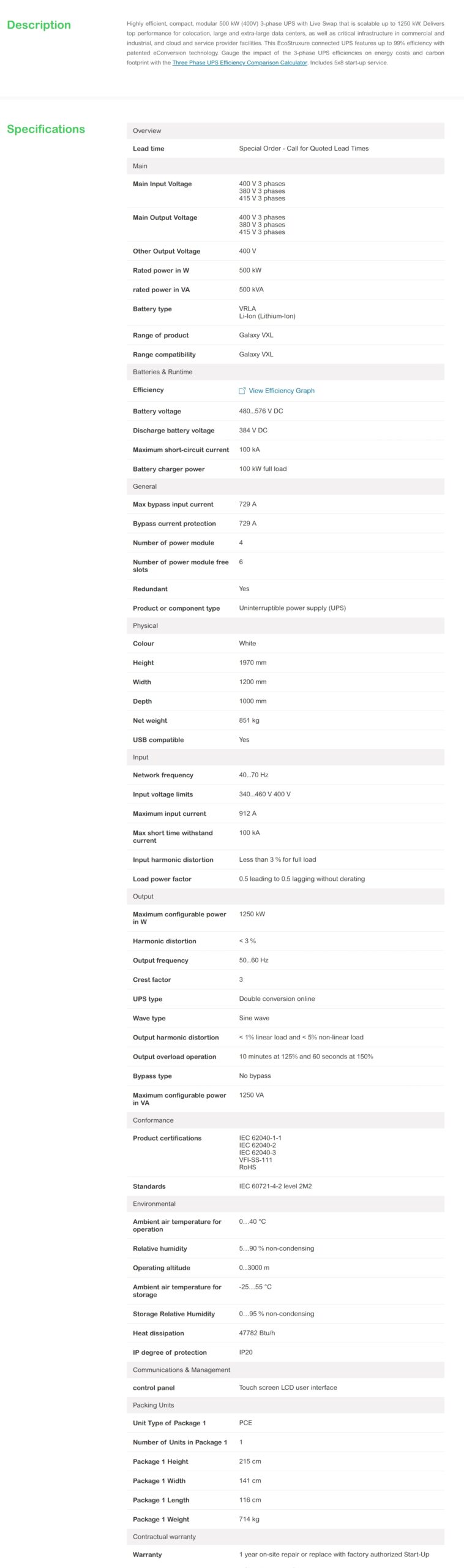 Galaxy VXL UPS 500kW Scalable to 1250kW 400V Start-up 5×8