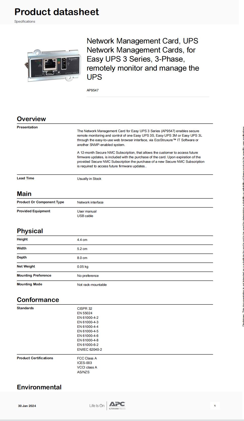 Network Management Card, UPS Network Management Cards, for Easy UPS 3 Series, 3-Phase,remotely monitor and manage the UPS
