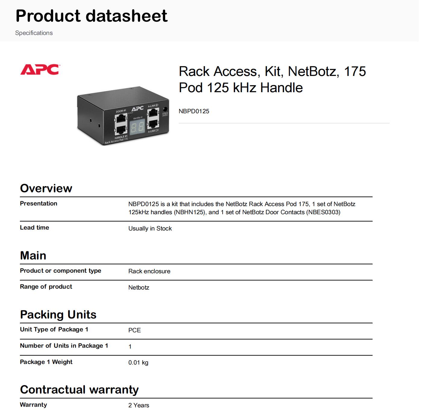 Rack Access, Kit, NetBotz, 175 Pod 125 kHz Handle