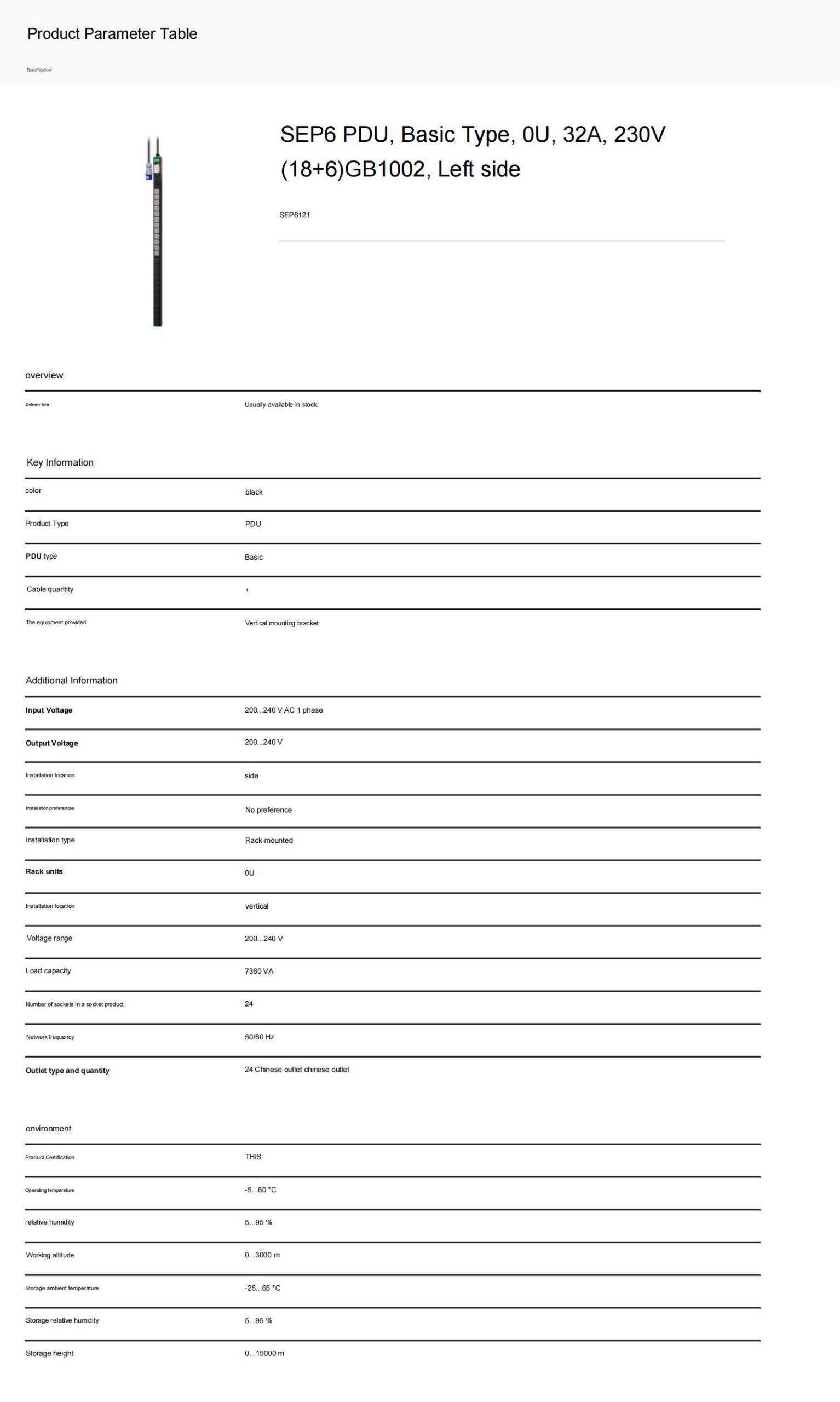 SEP6 PDU, Basic Type, 0U, 32A, 230V,(18+6)GB1002, Left side