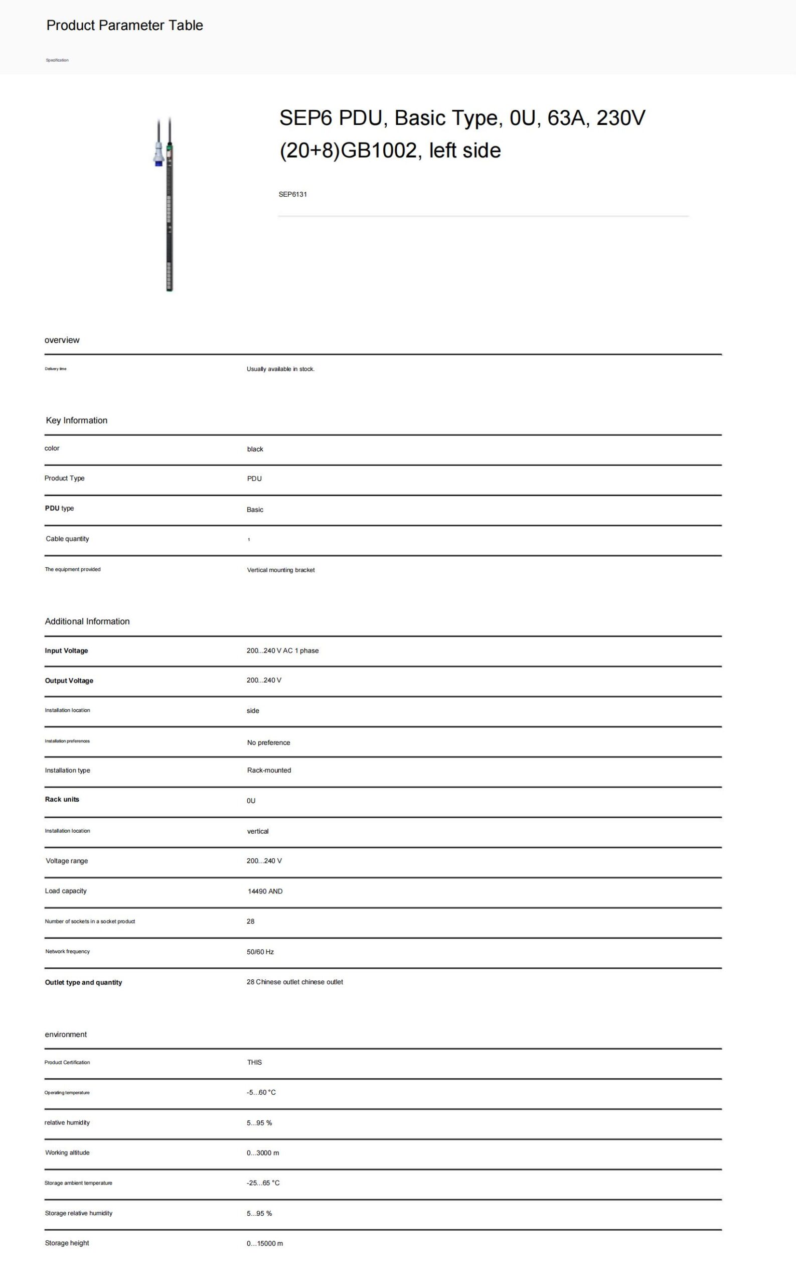 SEP6 PDU, Basic Type, 0U, 63A, 230V,(20+8)GB1002, left side