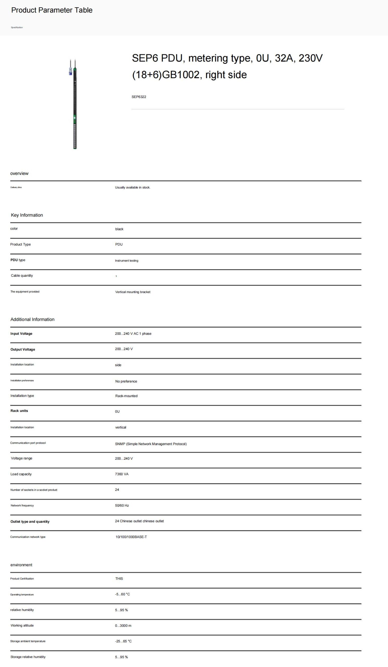 SEP6 PDU, metering type, 0U, 32A, 230V,(18+6)GB1002, right side