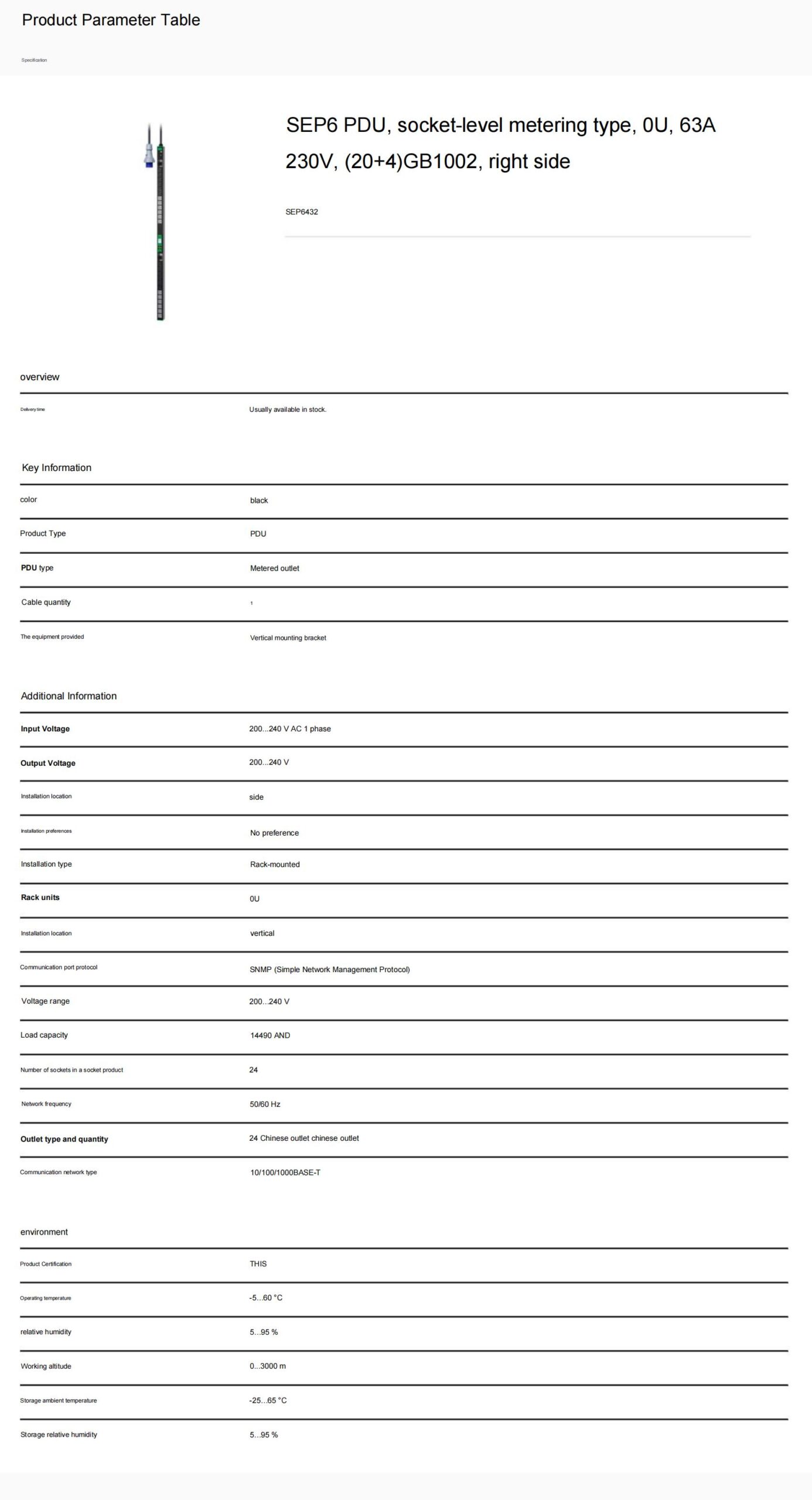 SEP6 PDU, socket-level metering type, 0U, 63A230V, (20+4)GB1002, right side