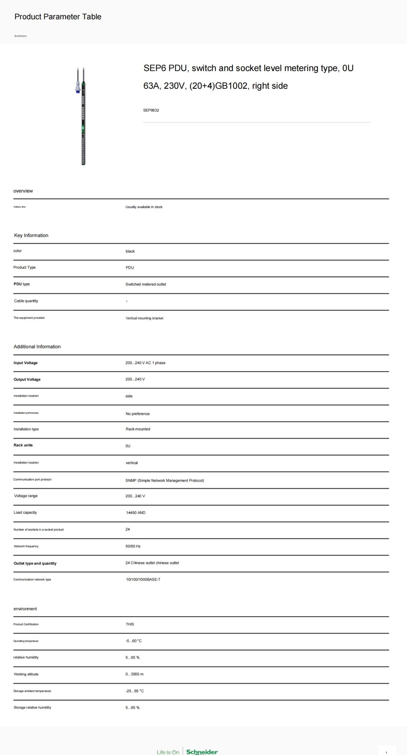 SEP6 PDU, switch and socket level metering type, 0U,63A, 230V, (20+4)GB1002, right side
